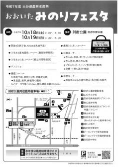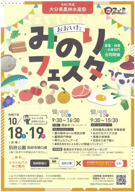 今年も「おおいたみのりフェスタ」が別府市で開催されます。農業・林業・水産業が一堂に会し、地元産品の販売や体験イベントが盛りだくさん!毎年大人気のふるさと産地直売コーナーをはじめ、郷土料理提供、森林・林業の展示販売、漁協による魚介類即売、畜産コーナーでは、バター作り(18日のみ)や搾乳体験(19日のみ)など、大分の「食」と「農林水産業」の魅力を体感できます。ステージイベントでは太鼓演奏や神楽、園児のお遊戯、馬場子供相撲大会、地元高校吹奏楽部の演奏なども楽しめます。ぜひご家族で足をお運びください。