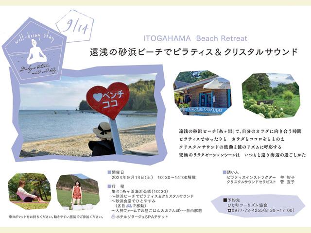 糸が浜海浜公園では、遠浅の砂浜ビーチで自分の体に向き合う時間「ピラティス」でゆったりと体と心を整え、クリスタルサウンドの音とリズムで癒しの時間を提供。