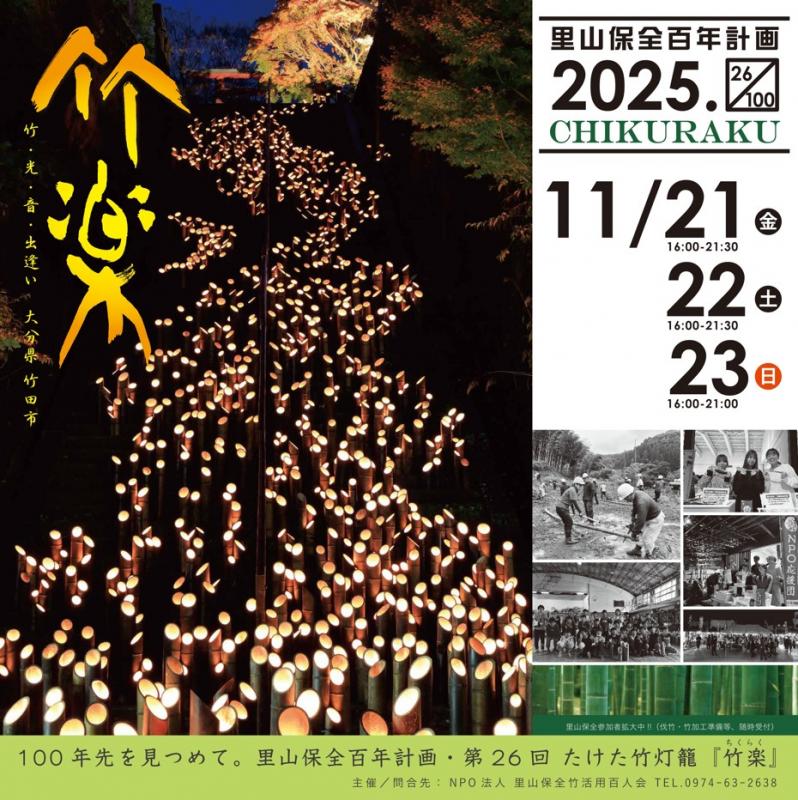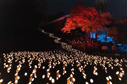 日が暮れるころ、竹田の城下町一帯に約2万本の竹灯籠が灯され、幻想的な世界が広がります。「竹楽」は、里山保全のために刈り出した竹を再利用し、100年先の未来を見据えたまちづくりの一環として行われるイベントです。秋の夜を照らす光の景色を、ぜひご覧ください。※詳細はホームページをご確認ください。