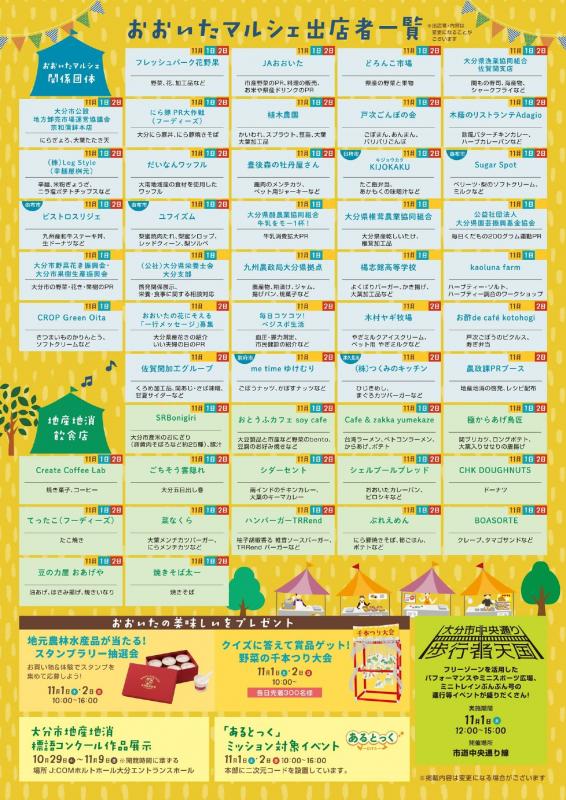 おおいたマルシェが今年も開催されます。本市で育まれた「おおいたの食」と農林水産物の“地産地消”、そして木材への親しみを深める「木育」をテーマとしたイベントです。新鮮野菜や惣菜・スイーツの販売のほか、木のおもちゃ遊び広場や木工ワークショップなども実施され、「おいしい」「たのしい」おおいたを満喫できます!また、地元高校生による書道パフォーマンスやお笑いライブなど、多彩なステージイベントも開催予定です。ぜひ足をお運びください。※詳細はInstagramをご確認ください。
