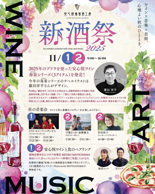 安心院葡萄酒工房で「2025新酒祭」が開催されます。今年仕込んだ新酒の発売をはじめ、音楽ライブやグルメ、ワイナリーツアーなど、ワインの魅力を五感で楽しめる2日間です。また、期間中は無料のシャトルバスも運行されます。ぜひ足をお運びください。※詳細はホームページをご確認ください。