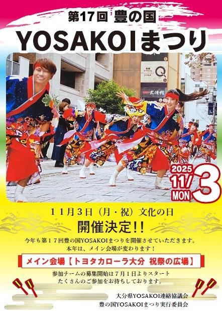 大分県下で唯一の本格的なYOSAKOIイベントとして、今年で17回目を迎えます。山口県や九州各県から34チーム、総勢550人の踊り子たちが参加し、個性豊かな衣装と力強い演舞が会場を彩ります。府内五番街やJR大分駅前など市内中心部で繰り広げられる熱気あふれる踊りの祭典に、ぜひ足をお運びください。※詳細はホームページをご確認ください。
