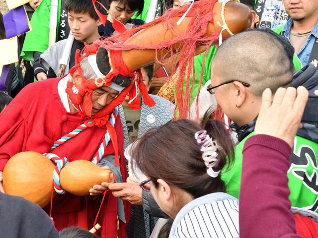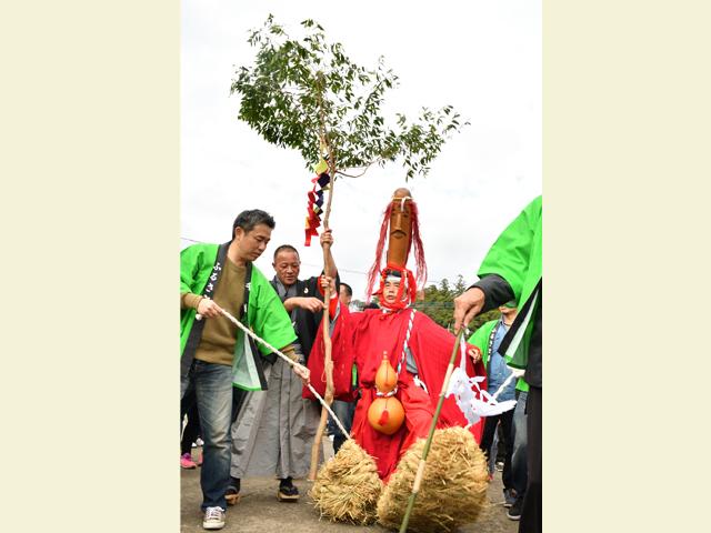 ひょうたん祭りが今年も開催されます。頭にひょうたん、赤い服、そして全長130cm・重さ10kgの大わらじというユニークないでたちの「ひょうたん様」が、3升も入る大瓢箪のお神酒を振舞いながら練り歩く奇祭です。もとは柴山八幡社に800年前から伝わる「霜月祭」で、県選択無形民俗文化財にも指定されています。ぜひ足をお運びください。※詳細はホームページをご確認ください。