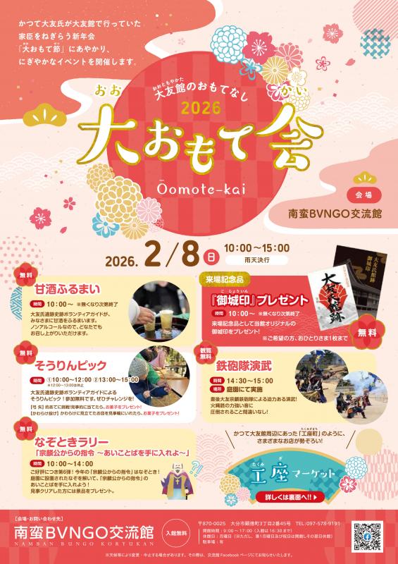 大分市の南蛮BVNGO交流館で「大おもて会」が開催されます。かつて大友氏が大友館で家臣をねぎらった新年会「大おもて節」にちなみ、南蛮BVNGO交流館を会場ににぎやかな催しが集結。ノンアルコール甘酒のふるまいや来場者限定のオリジナル「御城印」配布のほか、館跡を舞台にした「なぞときラリー」、かわらけ投げ、弓矢の的あて「そうりんピック」など体験企画も満載です。午後には豊後大友宗麟鉄砲隊による迫力の火縄銃演武も。グルメや雑貨が並ぶ「工座(たくみざ)マーケット」も同時開催なので、ぜひ足をお運びください。※詳細はホームページをご確認ください。