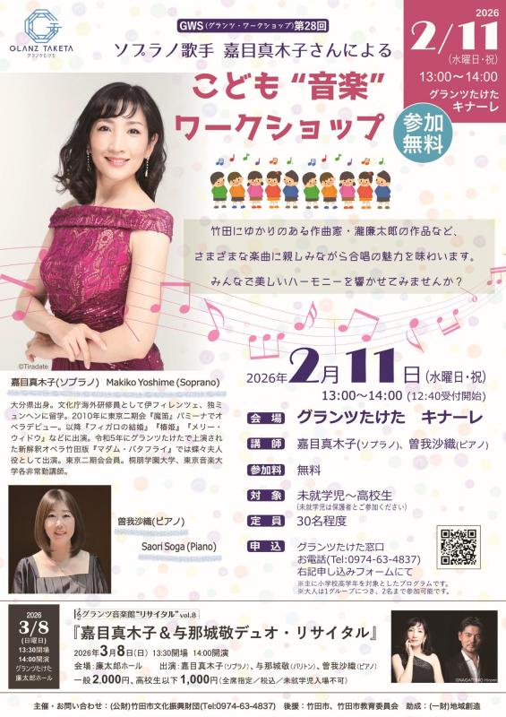 竹田市のグランツたけたキナーレにて『こども“音楽”ワークショップ』が開催されます。竹田版『マダム・バタフライ』でヒロインの蝶々さんを演じたソプラノ歌手・嘉目真木子さんによるワークショップです。プロの歌手と一緒に、音楽の楽しさを体感できる貴重な機会に、ぜひ足をお運びください。※詳細はホームページをご確認ください。