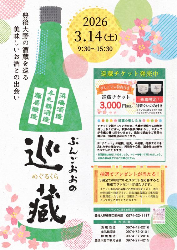 豊後大野市の歴史ある酒蔵を巡り、伝統製法で丁寧に仕込まれた日本酒や焼酎を飲み比べできる春の一大イベントが「ぶんごおおの巡蔵」開催されます。チケット1枚(税込3,000円)で最大9杯の試飲が可能で、先着限定の特製ぐいのみ付き。各会場には地元グルメを堪能できるおつまみ屋台も出店し、蔵巡りとあわせて楽しめます。ぜひ足をお運びください。※詳細はホームページをご確認ください。