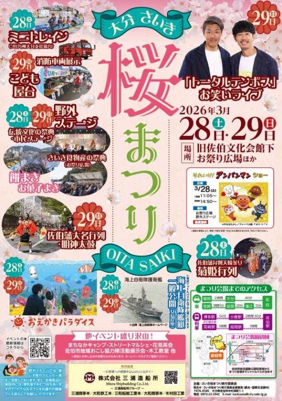 さいき桜まつりが今年も開催されます。旧佐伯文化会館下のお祭り広場を中心に、ミニトレインや消防車両展示、こども屋台など家族で楽しめる催しが盛りだくさん。野外ステージでは市民ステージや伝統文化の祭典などが行われます。また、「トータルテンボス」のお笑いライブやアンパンマンショー、佐伯藩大名行列・明神太鼓、海上自衛隊護衛艦の一般公開など、多彩なイベントが開催され、佐伯の春を盛り上げます。ぜひ足をお運びください。