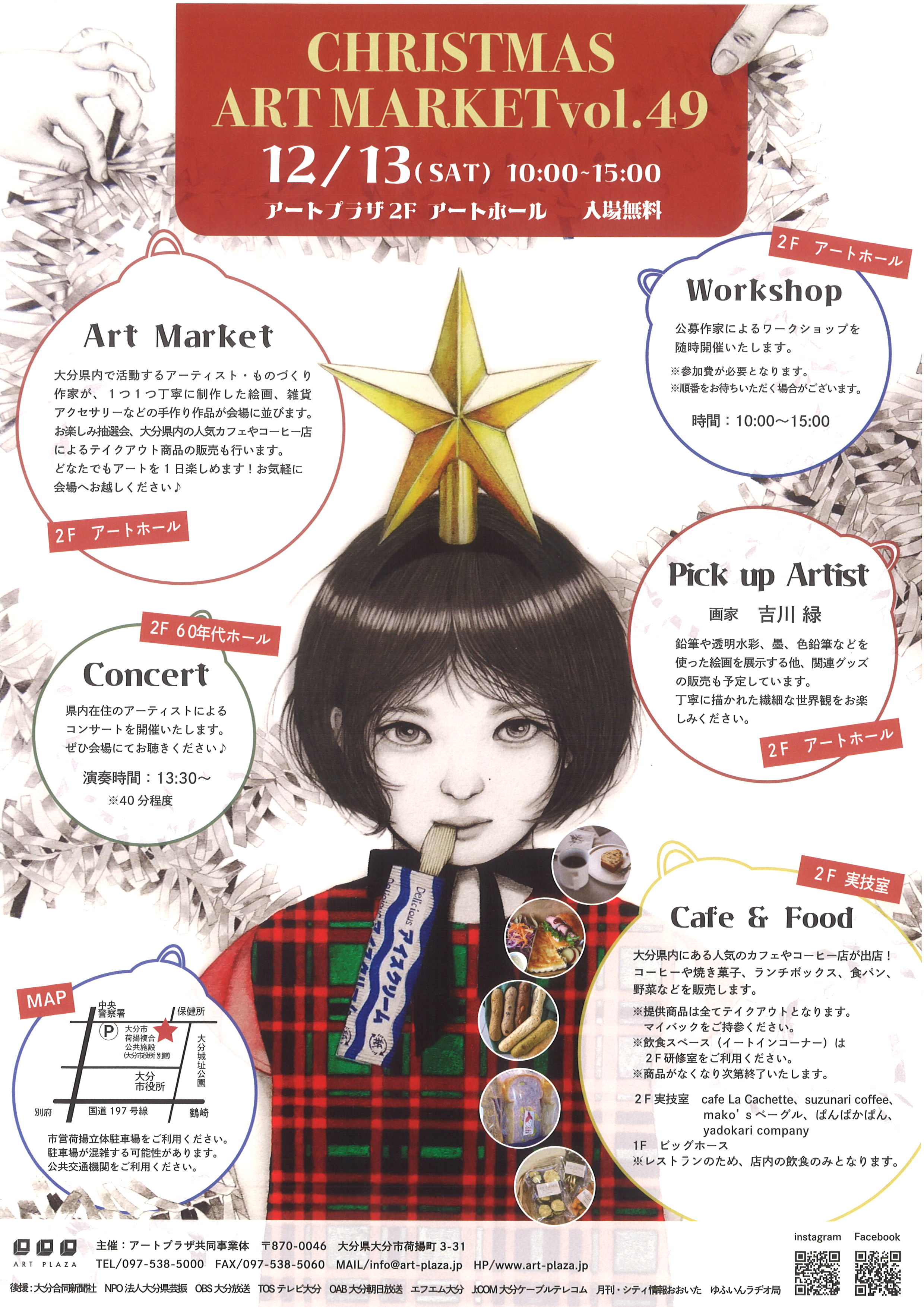 アートプラザにて、クリスマスアートマーケットが開催されます。大分県を拠点に活動するアーティスト・ものづくり作家32組が集まり、作品展示や販売を行う恒例の人気イベントです。今回の「ピックアップアーティスト」には、画家・吉川緑さんが登場。繊細な線や色づかい、独特の世界観が魅力で、会場では新作のほかポストカードなどのグッズも販売されます。さらに、2組のアーティストによるワークショップと、ライアーアンサンブル『NEU』によるコンサート、さらにお楽しみ抽選会など、楽しい企画も盛りだくさん。また、県内の人気カフェ・コーヒー店・パン屋によるテイクアウト販売もあり、アートも食も音楽も一度に楽しめる一日です。ぜひ足をお運びください。※詳細はホームページをご確認ください。
