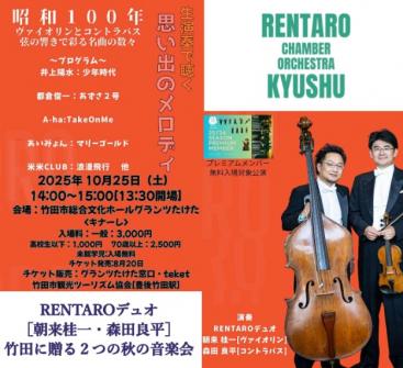 ヴァイオリン奏者・朝来桂一さんとコントラバス奏者・森田良平さんによるデュオコンサートが開催されます。井上陽水「少年時代」、都倉俊一「あずさ2号」、A-ha「Take On Me」、あいみょん「マリーゴールド」、米米CLUB「浪漫飛行」など、世代を超えて愛される名曲の数々を、弦の響きで優雅に奏でます。秋の夜、心地よい音楽に包まれるひとときをお楽しみください。