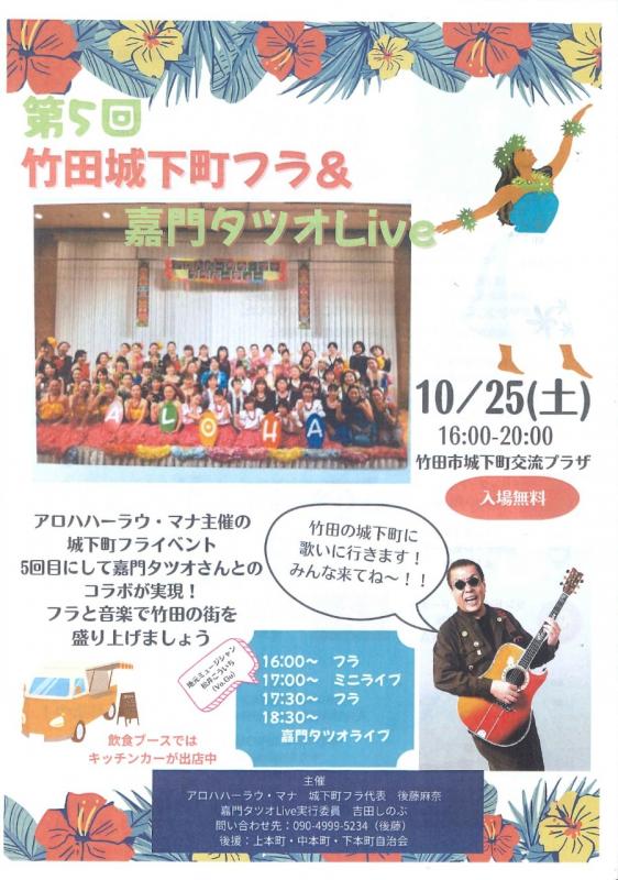 竹田城下町を舞台にした、アロハハーラウ・マナ主催のフライベントが今年も開催!スペシャルゲストとして、シンガーソングライター嘉門タツオさんが登場します。美しいフラダンスのステージと、楽しい音楽のコラボレーションを満喫。会場にはキッチンカーも出店し、食も楽しめる華やかなイベントです。ぜひお出かけください。