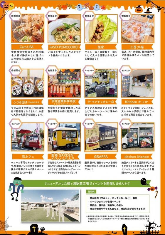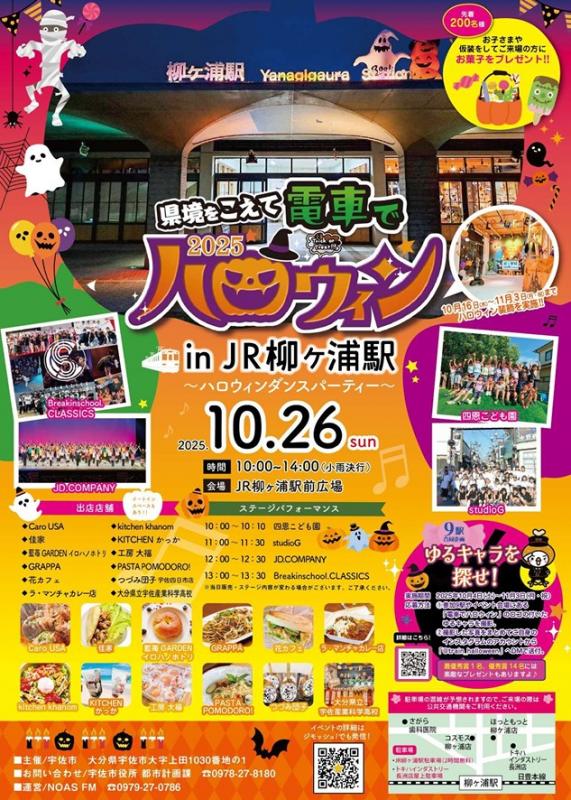 JR柳ヶ浦駅前広場でハロウィンダンスパーティーが開催されます。当日は仮装して来場されたお子様先着200名にお菓子をプレゼント!ステージパフォーマンスやキッチンカー、スイーツなどの出店あります。ぜひ足をお運びください。※詳細はホームページをご確認ください。