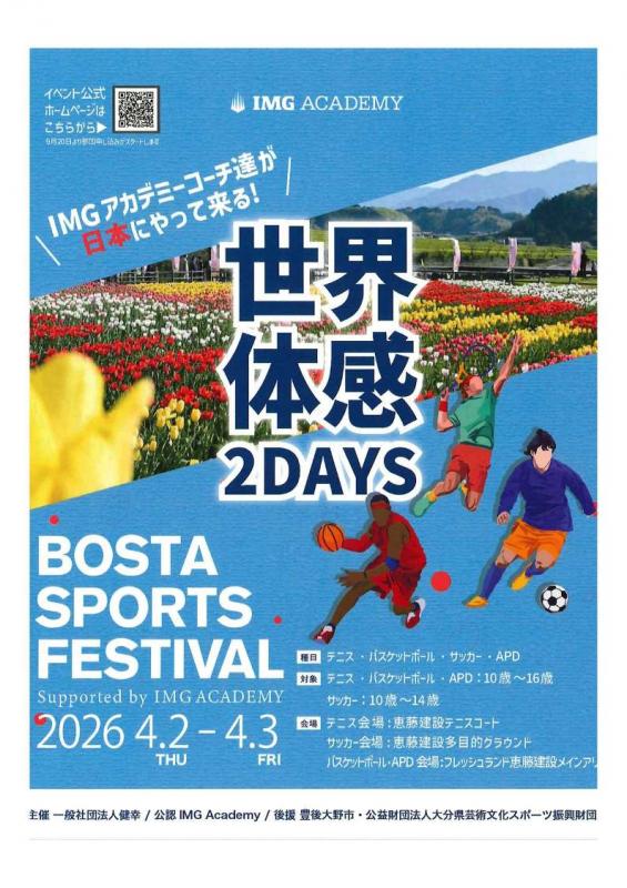 「BOSTA SPORTS FESTIVAL」が、豊後大野市にて開催されます。IMG Academy公認 のもと、2年の準備期間を経て実現する国際スポーツフェスティバルとなっており、米国の名門 IMG Academy のコーチ陣が来日し、テニス・サッカー・バスケットボールの三種目が実施されます。また、APDクリニックというIMGアカデミー独自の総合トレーニング実施されます。スポーツを通じて世界レベルのトレーニングを体験できる貴重な機会です。※対象年齢・参加申込みについての詳細はホームページにてご確認ください。
