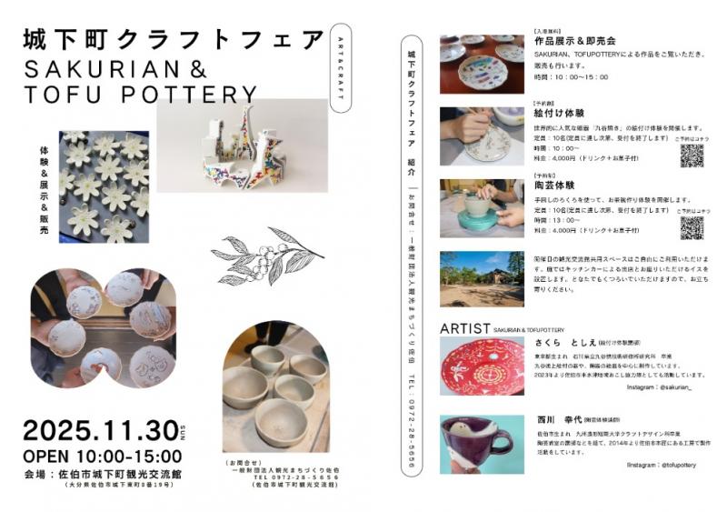 佐伯の城下町を舞台に、手仕事の魅力があふれる「城下町クラフトフェア」が開催されます。当日は陶芸体験や絵付け体験も。(予約制)陶芸や木工、ガラス、アクセサリーなど、県内外のクラフト作家が多数出展。お気に入りの作品を探しながら、秋のまち歩きを楽しめます。ぜひ足をお運びください。