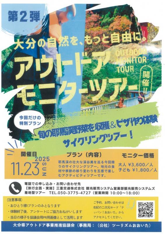 大分の自然を、もっと自由に。旬の耶馬溪野菜を収穫&ピザ作り体験付きのサイクリングツアーが開催されます!今回だけの特別プランとして、モニター価格での実施となり、耶馬溪の絶景を楽しむサイクリング+旬野菜収穫体験+ピザ作り体験などが企画されています。壮大な渓谷美を誇る耶馬溪をめぐり、地元の食材や季節の移ろいを五感で感じられるアクティビティツアーです。ぜひご参加ください。