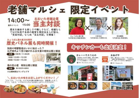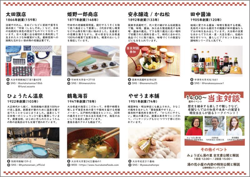 ほかにも、歴史を継承する楽しさや難しさなど、老舗ならではの知見や未来の展望を現役当主らが語る、「党首対談」ならぬ「当主対談」や、江戸時代より受け継がれる明礬製造の「歴史パネル展」、キッチンカーの出店もありますよ。