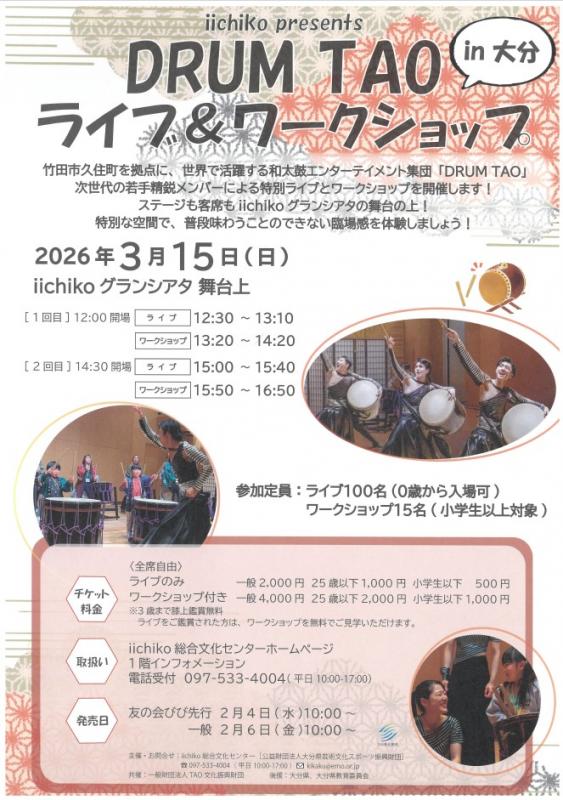 DRUM TAO ライブ&ワークショップ in 大分が開催されます。竹田市久住町を拠点に世界で活躍する和太鼓エンターテインメント集団「DRUM TAO」による、特別なライブとワークショップを実施。ステージを飛び出し、iichikoグランシアタの舞台上で臨場感あふれる迫力の演奏と体験を楽しめる貴重な機会です。特別な空間で、普段味わうことのできない感動を体感してみませんか。ぜひ足をお運びください。※詳細はホームページをご確認ください。