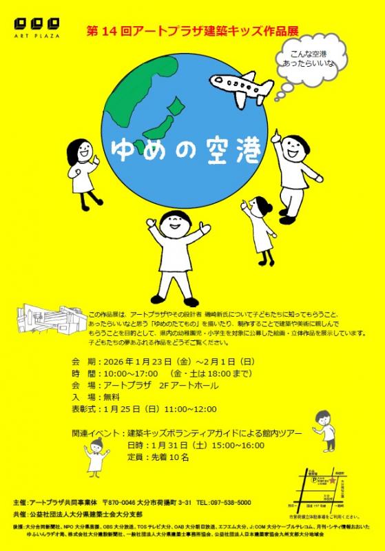 この作品展は、子どもたちに、「あったらいいな」と思う“ゆめのたてもの”を描いたり制作したりすることで、アートプラザの設計者・磯崎新氏についても知ってもらい、建築や美術に親しんでもらうことを目的とし開催されます。今回は「ゆめの空港」のテーマで、県内の幼稚園児・小学生を対象に公募した絵画・立体作品を展示しています。また、関連イベントとして、1月31日(土)には、建築キッズボランティアガイドによる館内ツアー(先着10名)も行われます。子どもたちの夢あふれる作品を、ぜひ会場でご覧ください。※詳細はホームページをご確認ください。