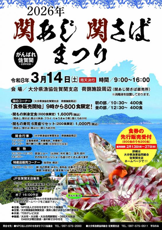 関あじ・関さばまつりが今年も開催されます。豊予海峡の急流にもまれ身の引き締まった関あじ・関さばは、食通をうならせる最高の味。当日は、新鮮な「関もの刺身(関あじ・関さば・関ぶり)定食」800食(うち200食は先行販売あり)や、「関もの寿司6貫セット」200食(食券は当日現地販売)が登場します。