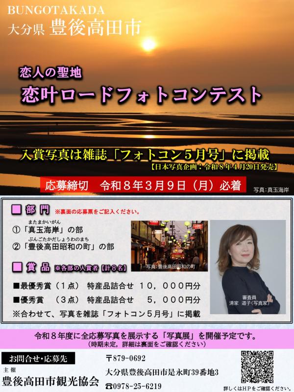 恋人の聖地“恋叶ロード”を舞台に、「真玉海岸の部」と「豊後高田昭和の町の部」の2部門で作品を募集しています。入賞者には特産品詰め合わせセットが贈られるほか、日本写真企画発行の雑誌「フォトコン5月号」への掲載も予定です。カメラを片手に、ぜひ豊後高田市にお出かけください。※応募等の詳細はホームページをご確認ください。