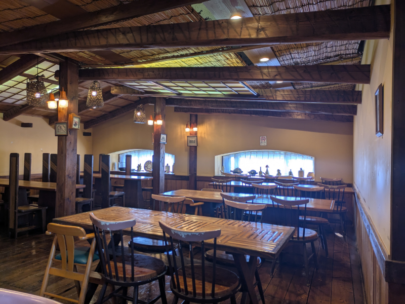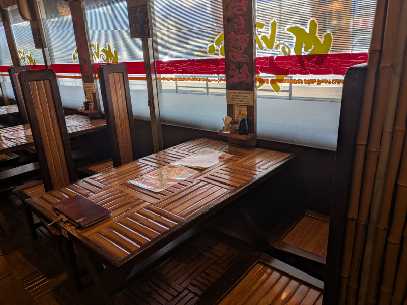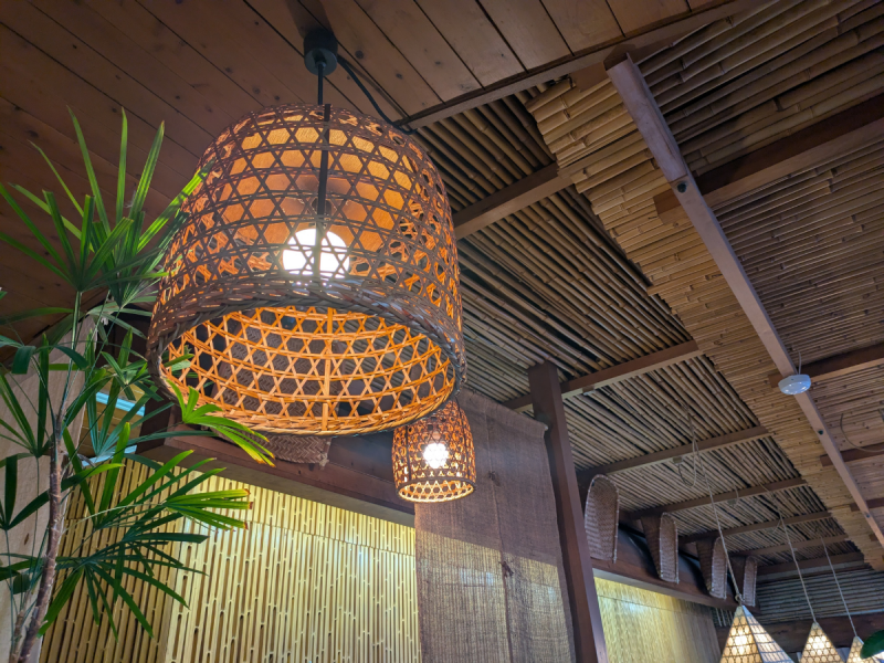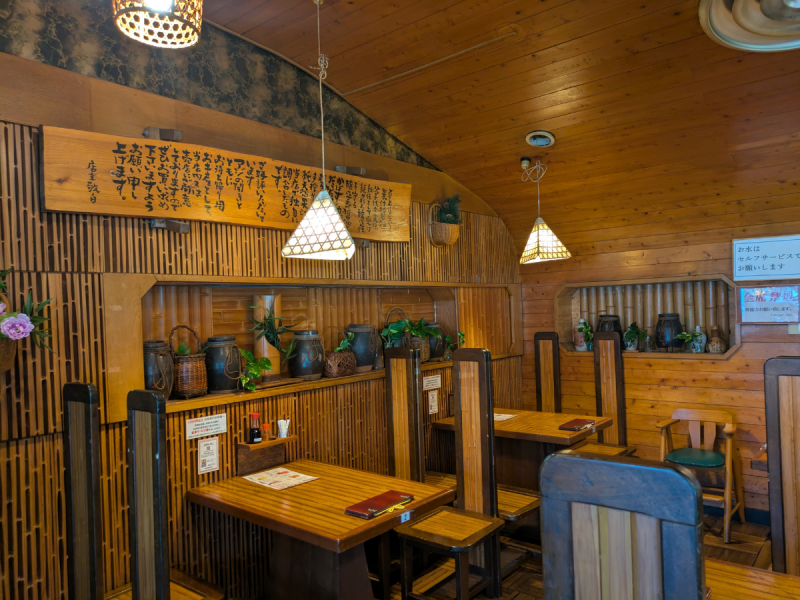 店内は、竹をふんだんに使った空間で、椅子やテーブルはもちろん床、天井、店内にある照明などの小物もすべて竹素材です。昭和の喫茶店のような落ち着いた雰囲気が魅力です。