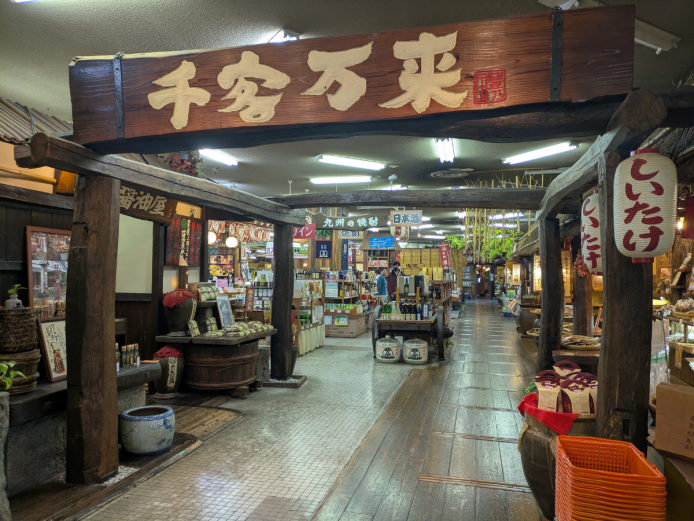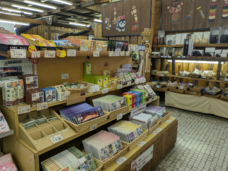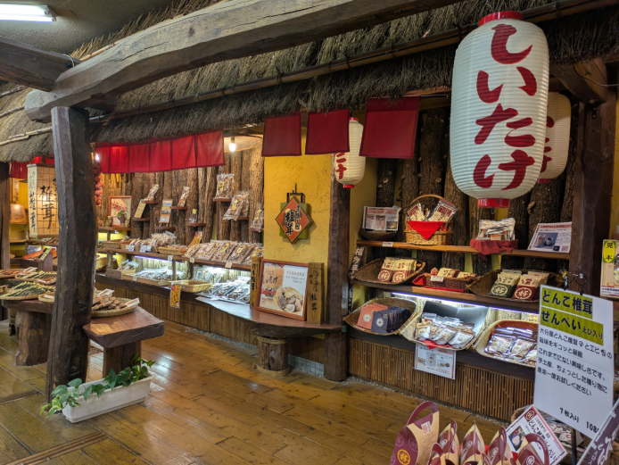 1階のお土産処は、大分県内最大級の品揃えで、数千点以上の商品が並びます。大分の地酒・焼酎や入浴剤、大分銘菓、味噌や醤油といった地元調味料、さらにはレトロ感溢れる玩具や雑貨まで幅広く揃っており、旅の思い出を彩る買い物にぴったりです。
