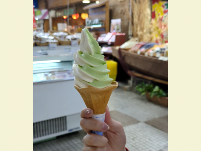 ここでは、かぼすソフトクリームが味わえます。今回はかぼすと濃厚ミルクのミックスをいただきました。かぼすのさっぱり感とミルクの濃厚さが絶妙です。なんといってもコーンの中までしっかり詰まっていて、食べ応え抜群です!