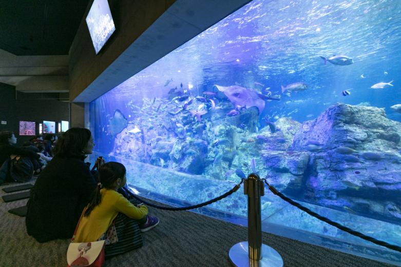 水槽の目の前の床に座りながら、えさやりの様子などを間近で見るので、自分も海中にいるような気分です。