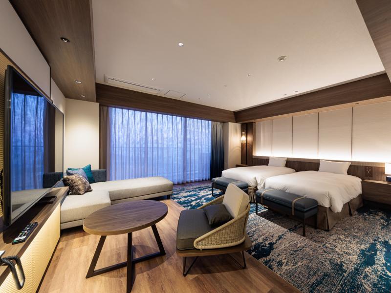ブルー、グリーン、夕焼け色の3つのテーマカラーが設定されていて、どの客室も別府の伝統工芸品である竹をあしらったり、こだわりの調度品を飾るなどシンプルながらも高級感溢れる空間となっています。