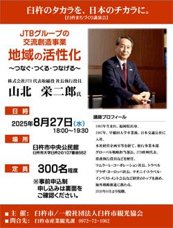 8月27日(水)、株式会社JTB 代表取締役社長執行役員 山北栄二郎氏を講師にお迎えした講演会「観光まちづくり講演会 臼杵のタカラを、日本のチカラに。」が開催されます。