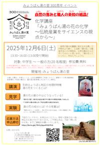 天然の入浴剤「薬用 湯の花」の製造・直売所『みょうばん湯の里』が創業300周年記念イベントの一環として化学講座「みょうばん湯の花の化学 ~伝統産業をサイエンスの視点から~」を開催します。