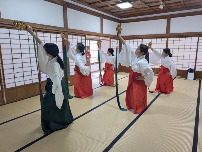 巫女装束に着替え、神宮について学ぶほか、宇佐神宮での参拝作法や玉串奉奠の方法などの指導を受け、巫女の大切な仕事の一つである、神楽舞の体験をした後、本殿での正式参拝や神楽奉納に参列できます。