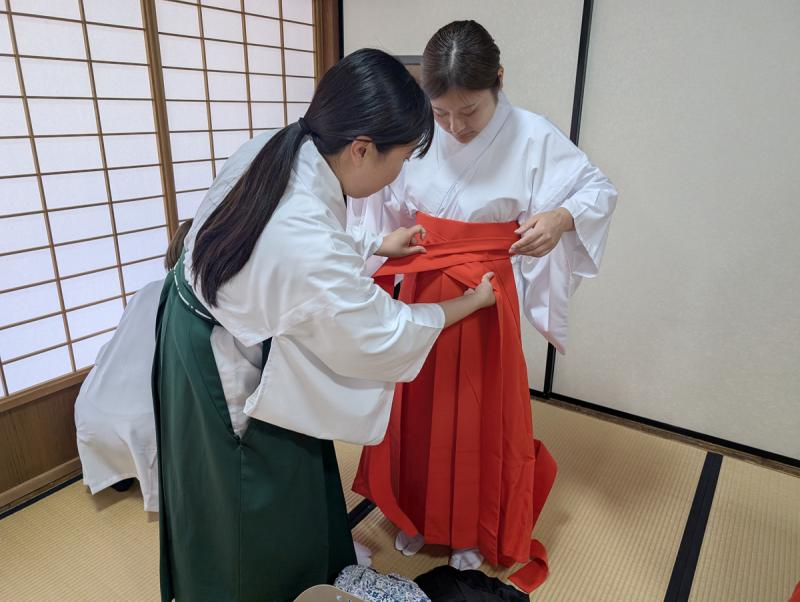 今回の体験では、神に仕える巫女となることで、特別に本殿での参拝ができます。