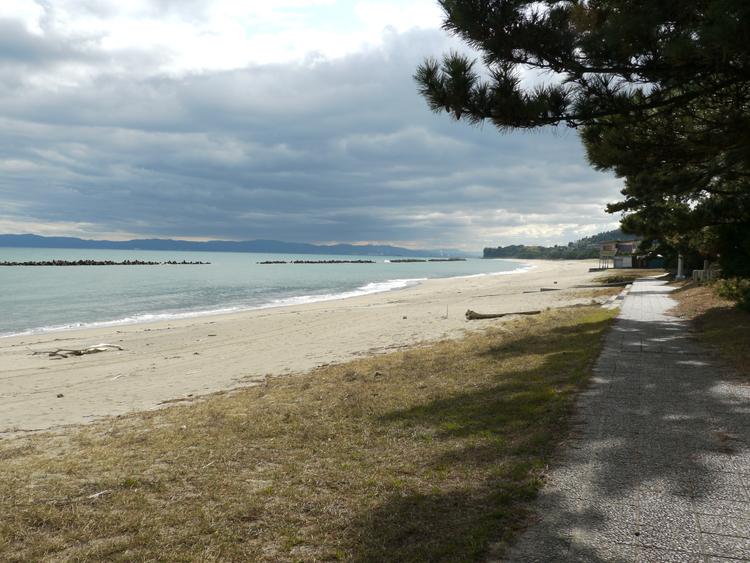 伊予灘に面して南北約2kmにわたって続く砂浜に、みごとな枝ぶりのクロマツの老木が並ぶ風光明媚な海岸で、日本の白砂青松100選に選定されています。