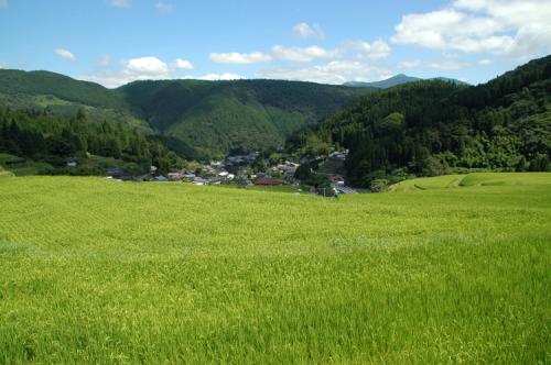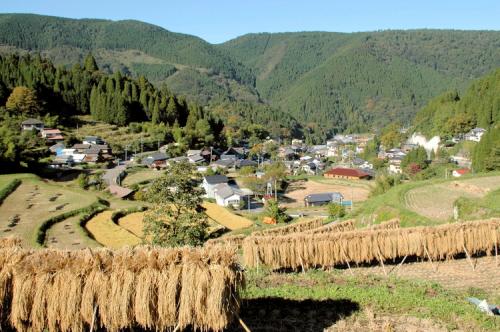 湯平温泉街から車で約5分のところ、標高約500mの位置には美しい棚田が広がっています。 夏は、稲の緑色と空の青色のくっきりとしたコントラストが美しく、秋には収穫時期を迎えた稲穂で黄金色に染まります。また、収穫した稲が並ぶ姿はのどかで、まさに日本の里風景の姿です。収穫された米は、湯平温泉の旅館で味わうことができます。