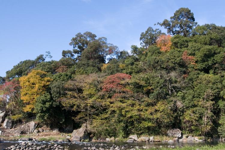 東側のみどり橋に架かる水辺にはせせらぎが流れ、歴史的な歌にも詠まれた景勝の地である、日田市を代表する水辺景観地です。奇岩にはイチイガシやムク、エノキ等の数百年の老樹が茂り、紅葉の時期に木々を彩ります。また、西側には桜が植えられ、花見の名所としても知られています。別名“日隈公園”と呼ばれる公園にはすべり台やブランコなどの遊具もあり、市民や観光客から散策の場として親しまれています。
