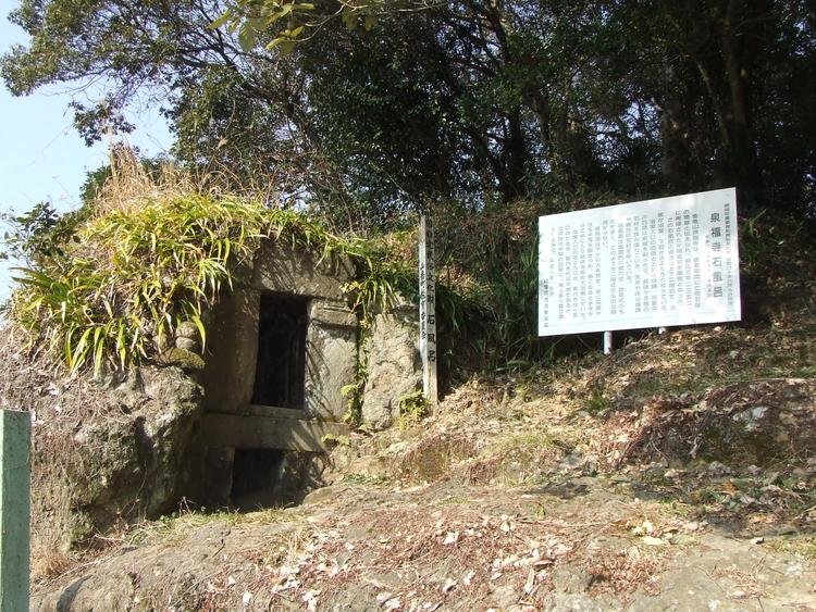養老年間に開基された泉福寺は、明治初めに廃寺となり、現在は田園の中に盛り土のようなこんもりと樹木が茂っていいる中に、泉福寺の国東塔と石風呂が残されています。石風呂は2階式となっており、1階部分で火を焚き、上側の床石を暖め、2階部分の床に石菖やヨモギなどを敷き詰め熱くなると水をかけて中をサウナ状態にした上で、中に入り身体を温めて治療したとあります。国指定重要有形民俗文化財となっています。