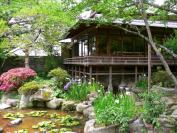 蓬莱観は、明治15年に建築された劇場で、当代きっての歌舞伎役者や有名役者が公演を行い、近隣や県外から多くの観客が訪れ賑わいを見せていました。戦時中の強制疎開により建物の取り壊しにあいましたが、戦後まもなく、この場所に日本庭園が整備され、現在は四季折々にその姿を変える風光明媚な場所となっています。庭園には桜の木が多く、中でも楊貴妃という江戸彼岸桜は、春には華麗な花を咲かせ、散った花びらが庭園中をピンク色に染め、まるで花びらの絨毯を敷いたような、得も言われぬ景色に魅了されます。また、新緑や紅葉の時期には、庭園の木々が美しく彩り、多くの観光客が訪れています。