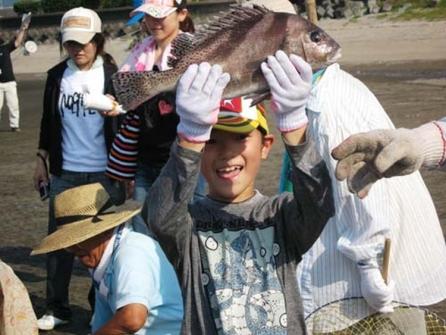 入江全体を建網で封鎖し、干潮時に中に閉じ込めた魚を網で獲る「建干し網漁体験」や、長い網を張り、それを皆で引き上げて魚を獲る「地引き網漁体験」では、チヌやタイ、スズキやタコなど色々な魚が獲れ、その魚をその場で調理して食べることができます。青い空の下でバーベキューを楽しんだり、活きの良い魚を刺身にして食べるのは格別です。また、ユニークな「まて貝掘り体験」は、潮が引いた砂浜を少し掘った所にあいている穴に塩を振りかけ、まて貝がにゅっと顔を出したところをキャッチするもので、大人も子供も一緒になって楽しめます。体験に行くときには、事前に予約が必要です。(タオルや軍手など、各体験に必要なものはホームページを参考にしてください。)