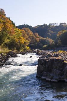 柱状節理とはマグマなどが冷え固まる際に柱状に入る亀裂のこと。この十川では、9万年前に起こった阿蘇山の大爆発の際、大量の火砕流が流れ込み、それが冷えて固まったものが見られます。河川に侵食されると角柱状に整然と崩れていきますが、江戸時代にはそれをさらに堀割りここに船を通していました。