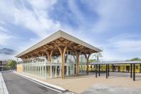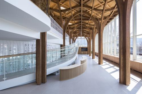 県立美術館を設計した建築家 坂茂氏が手掛けた建物は、全面ガラス張りとなっており、雄大な由布岳を望むことができます。また、梁や柱は緩やかな曲線を描いており、まるで森の中にいるような空間となっています。