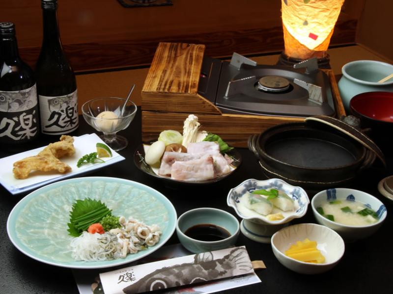 元々は遊郭として営業していたお店で建物の一部や石垣は当時の姿のまま利用し、ロビーの梁には、第2次世界大戦の際についたとされる銃弾の跡が今も残っています。 海産物の味が高まる要素がそろった豊後水道を目前に抱き、高級ブランドとして知られる関アジ・関サバをはじめ、海の幸に恵まれた土地です。 さらに食通の間で名が通っているのが、臼杵のフグ。 臼杵では古くからフグ料理の文化が根付き、フグを扱うお店が数多く存在し、都会に比べて格段にお手頃な価格で楽しめます。 (2022.2)