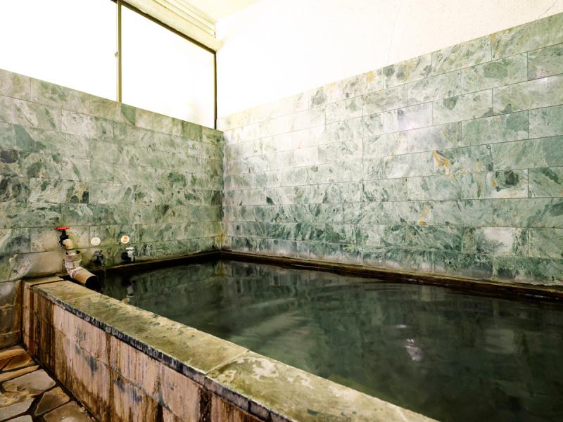 館内の3階にある温泉は、内湯のみ。鄙びた風情が漂う湯船には、地下2.4mから湧く湯が竹筒からこんこんと注がれており、わずかに青みがかったお湯からは、しっかりと硫黄の匂いが感じられます。その質の良さは、少し入浴しただけでも肌がツルツルになることを実感。手でそっとかき混ぜると湯の花が舞うことから、さまざまな成分が含まれていることが分かります。