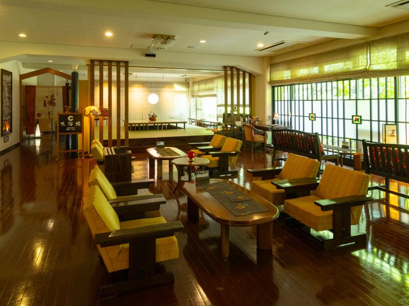 品種さまざまな椿の木が美しく庭を彩る湯宿。そのモチーフを至るところに散りばめた柔らかな雰囲気が、訪れる人を迎えてくれます。一転、ロビーの先にある温泉に足を踏み入れると、鍾乳洞を彷彿とさせる大きな岩が。自然の温かさとダイナミックさの両方を感じられるところに、このまちらしさが宿っています。