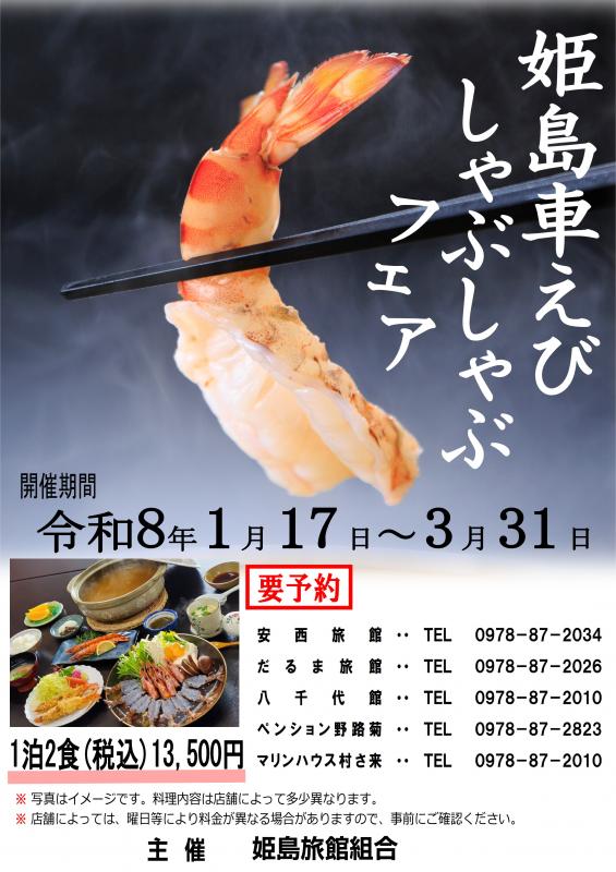 姫島村にて「姫島車えび しゃぶしゃぶフェア」が今年も開催されます。プリプリとした歯ごたえと上品な甘みが自慢の「車えびしゃぶしゃぶ」。その車えびをふんだんに使った贅沢メニューが味わえる宿泊プランが、通常1泊2食付き16,500円(税込)のところ、フェア期間中は特別に13,500円(税込)で楽しめます。各施設にご予約の上、ぜひ足をお運びください。※詳細はホームページをご確認ください。