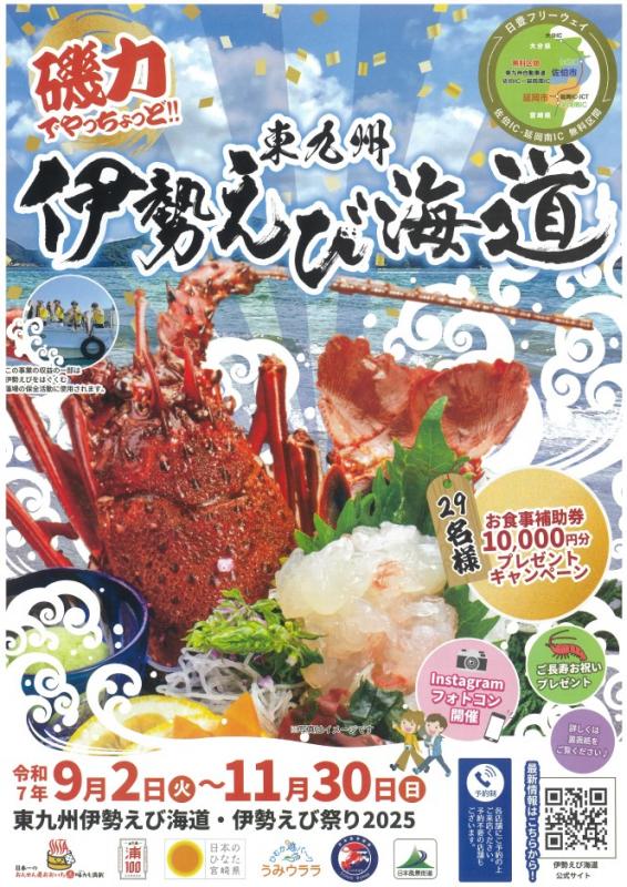 毎年恒例!伊勢えび漁の解禁に合わせ、9月からの3ヶ月間恒例で開催されている「東九州伊勢えび海道・伊勢えび祭り」が今年も開催されます!佐伯市から延岡市までの海道筋にある飲食店が参加、自慢の伊勢えび料理を提供しています。期間中は、フォトコンテストや伊勢えびが当たるキャンペーン、ご長寿お祝いプレゼント抽選会なども行われます。対象店舗やイベントの詳細は、HPをご覧ください。