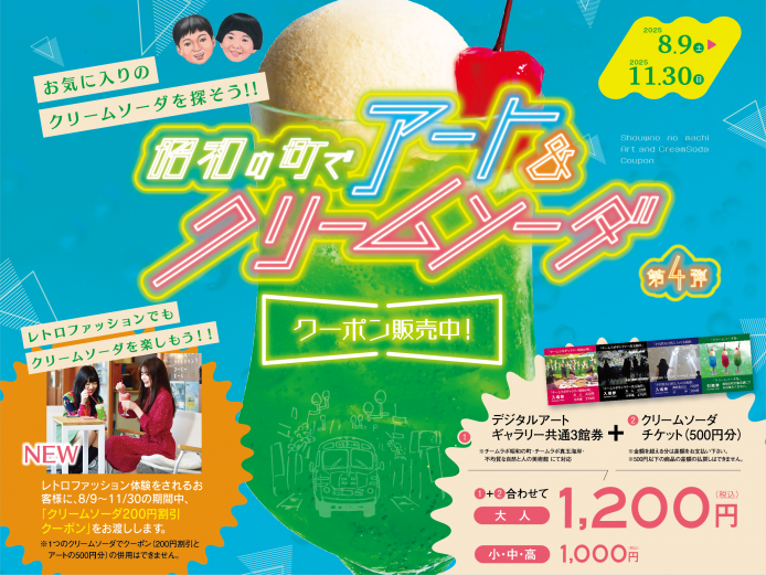 昭和の町商店街では、約14店舗が参加し、彩り豊かなクリームソーダが楽しめます。昭和のノスタルジーとフォトジェニックな世界観を満喫できる人気企画です。さらにアート鑑賞も一緒に楽しめるお得なクーポンも販売中!ぜひ足をお運びください。※詳細はホームページをご確認ください。