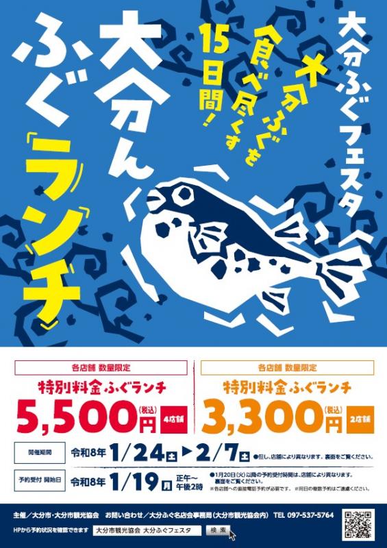 大分ふぐの美味しさをより多くの方に知っていただくために、大分ふぐ名店会の加盟店が期間限定の特別ふぐランチを提供する「大分ふぐフェスタ」が開催されます。3,300円または5,500円(税込・数量限定)で味わえる、この時期ならではの“ふぐランチ”は、事前予約が必ず必要となりますので、ご予約のうえ足をお運びください。(※翌日からは、店舗により受付時間が異なります。)※予約開始日時など詳細はホームページをご確認ください。