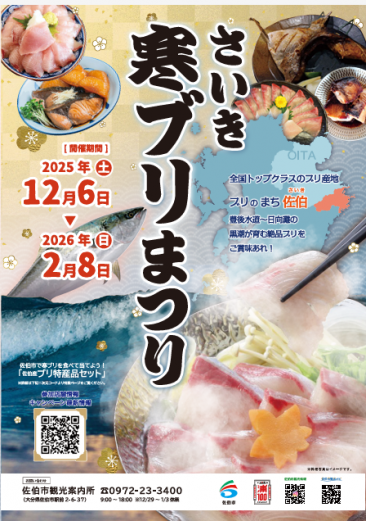 佐伯市にて、冬の味覚・佐伯の寒ブリを堪能できる食のキャンペーン「さいき寒ブリまつり」が初開催されます。佐伯市内の飲食店・宿泊施設 21店舗で、全国トップクラスの“佐伯産ブリ”を使った特別メニューが登場します。該当メニューをご注文いただき、店舗に設置されたQRコードからアンケートに回答された方のなかから、抽選で10名様に「佐伯産ブリ特産品セット」が当たるチャンスも。ぜひ足をお運びください。