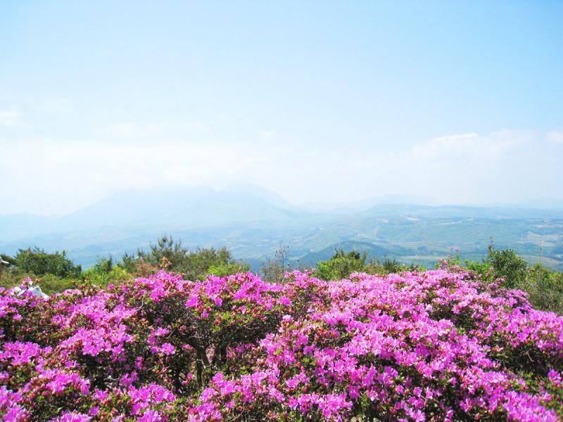 九州最大級のミヤマキリシマの群生地。八合目まで車で行くことができ、駐車場から最初の群生地「吉武台(よしぶだい)」までは約30分。さらに奥の群生地「お花畑」までは片道1時間ほどで、ピンク色の絶景に出会うことができます。