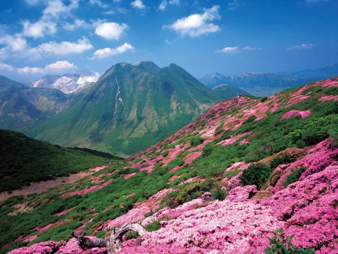 大分県のミヤマキリシマを代表するくじゅう連山。雄大な山を背景に、鮮やかなピンクと緑のコントラストが斜面一面に広がります。特に「平治岳(ひいじだけ)」からの展望は素晴らしく、眼下には坊がツルの草原が広がります。